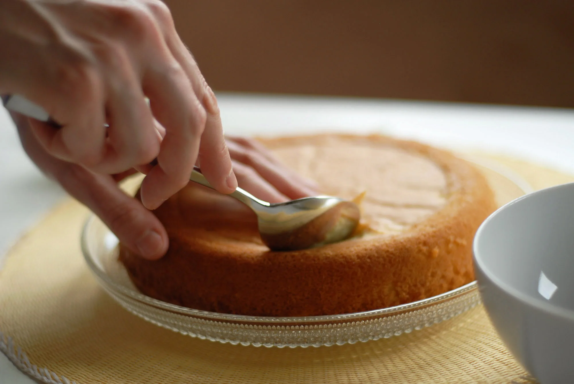 Use a sharp knife to cut a circle about 2 cm from the edge. With a spoon, lift out the middle part of the cake. But be careful not to pierce the base!